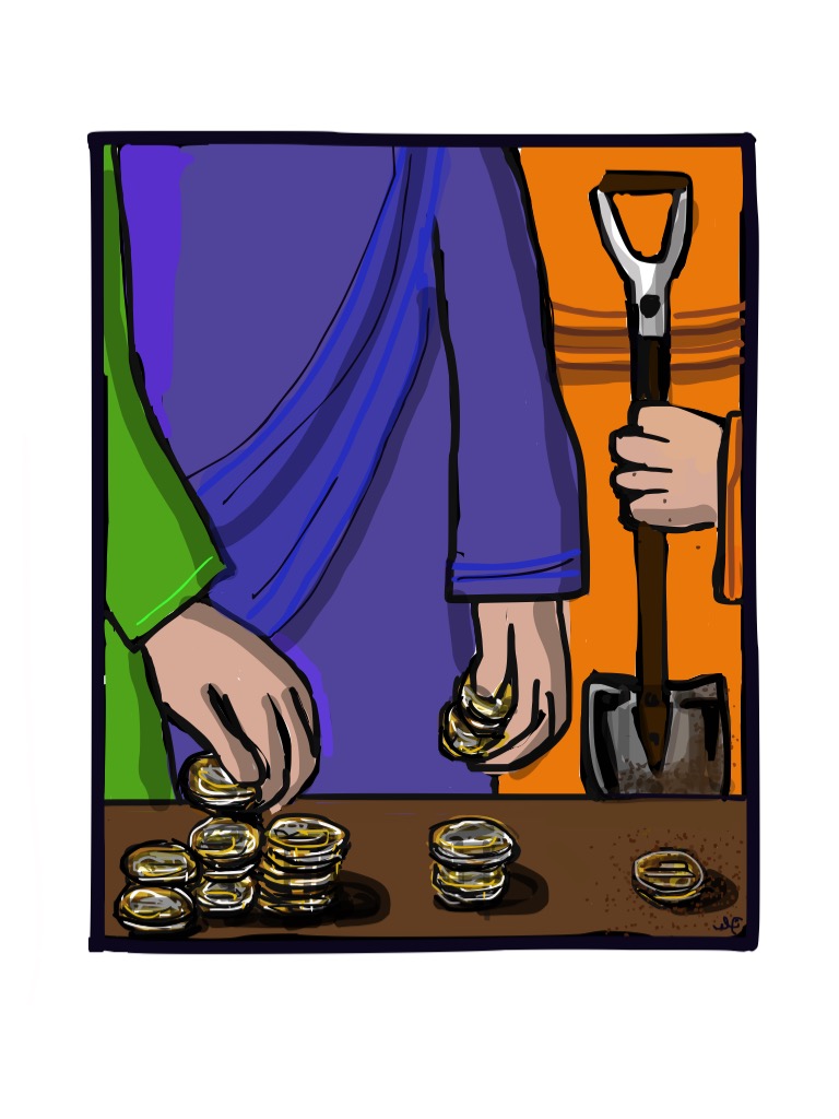 A uno le dio diez, a otro cinco, y a otro uno. Los dos primeros negociaron con lo encomendado y lo duplicaron; el tercero enterró su talento. Cuando el señor volvió y recibió las cuentas, felicitó a los dos primeros llamándolos siervos buenos y fieles, prometió confiarles mucho más y los invitó a participar de su alegría. Al último en cambio, lo regañó duramente, lo llamó siervo malo y perezoso, mandó que lo echaran fuera y que le dieran su talento al que tenía diez, diciendo "al que tiene se le dará y le sobrará; pero al que tiene poco, se le quitará aun eso poco que tiene" (Mt 25,29).